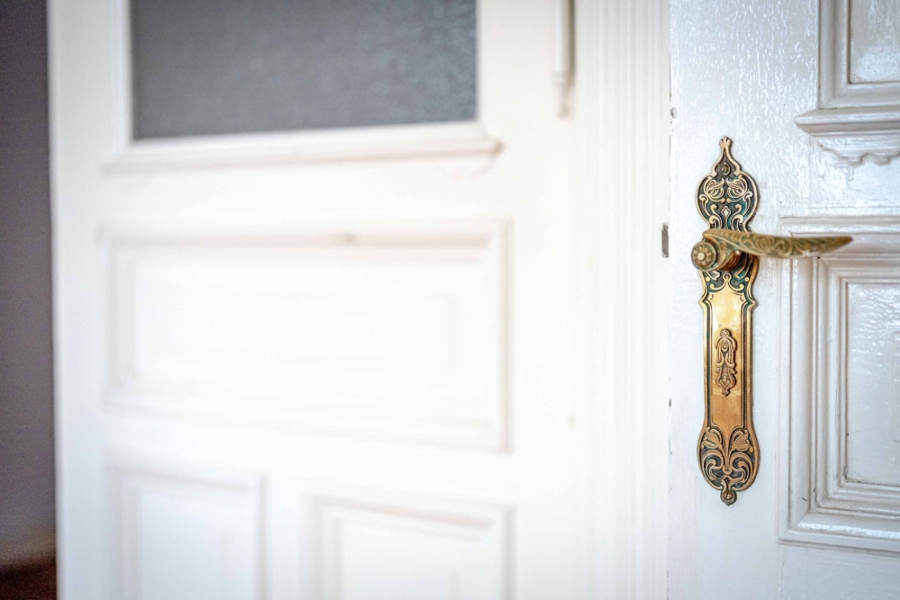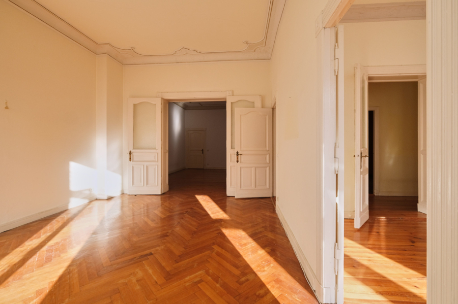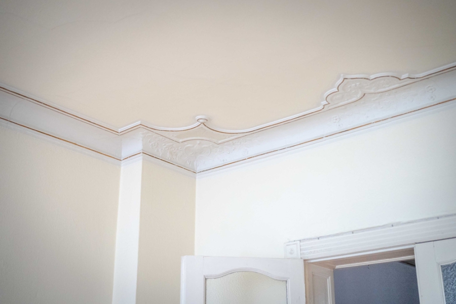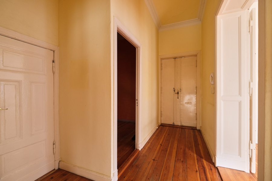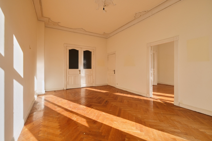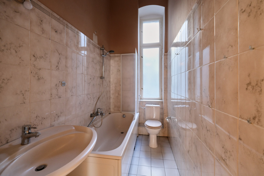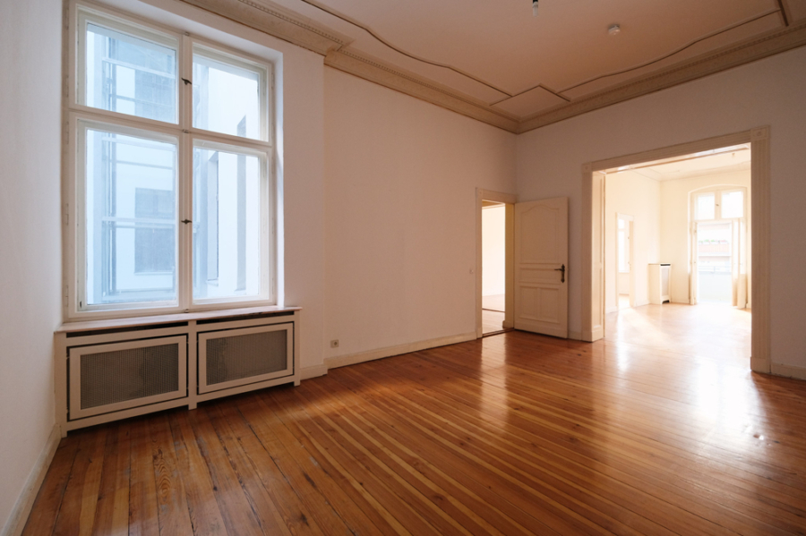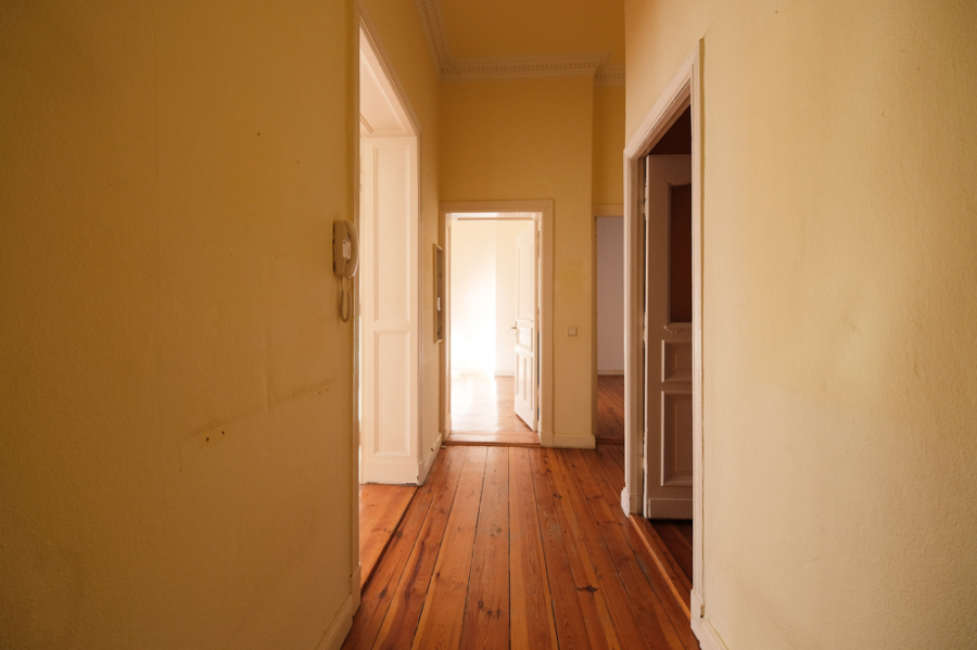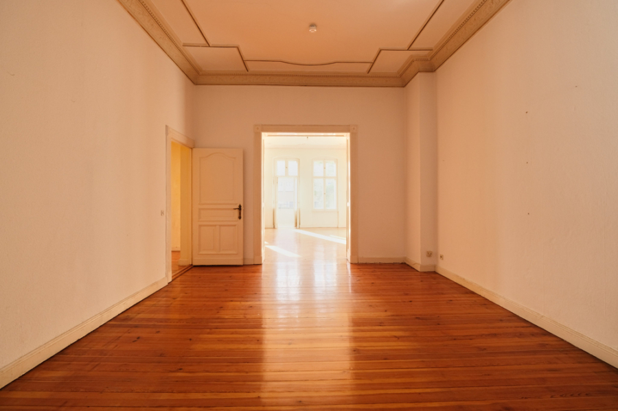 The spacious apartment is located on the 2nd floor and still has the original floor plan with 4 beautiful living rooms, 1 bathroom and a kitchen. All rooms are connected via a small hallway and the typical old building elements such as stucco, parquet flooring, floorboards, wooden interior doors and double box windows are still present.