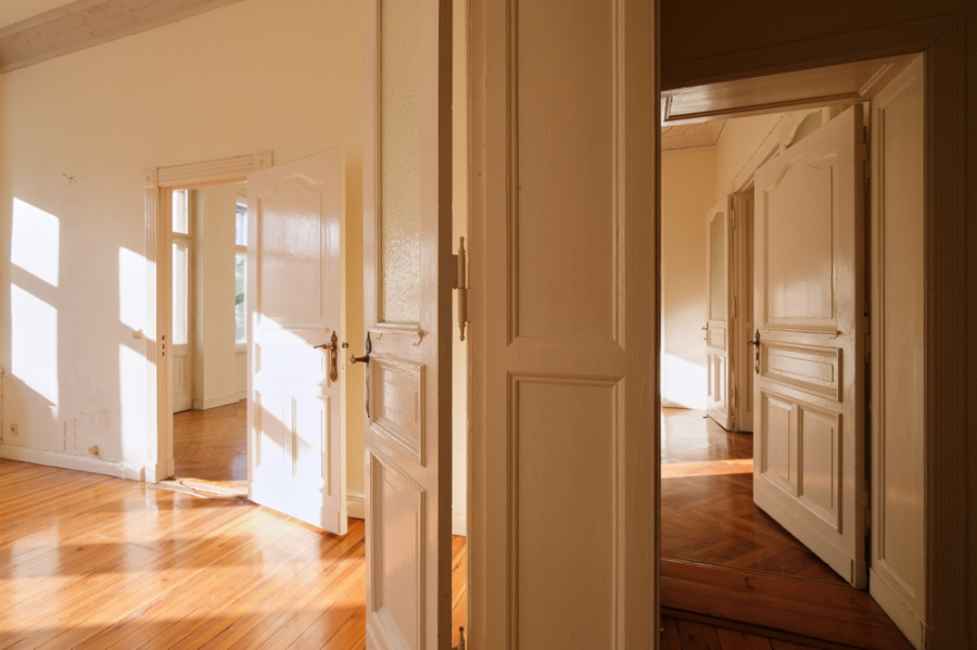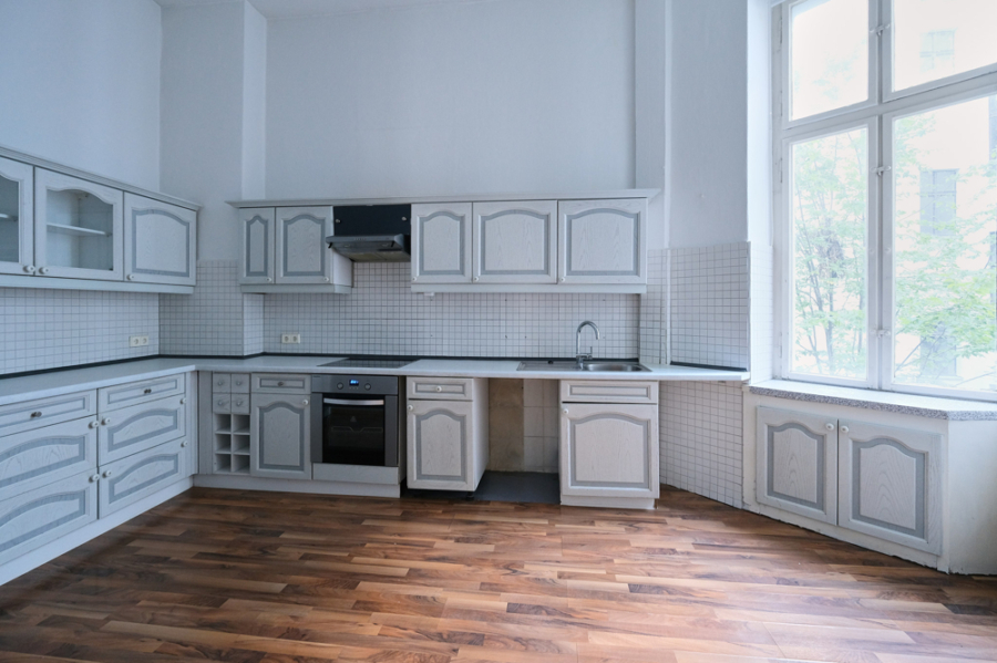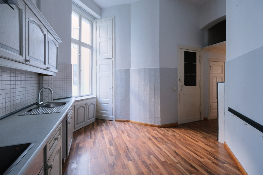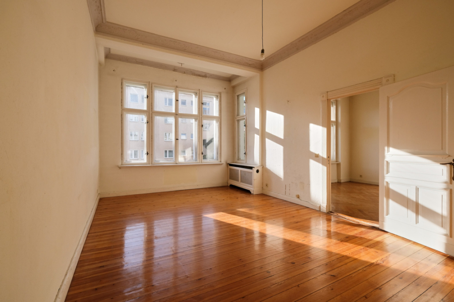 Die Wohnräume haben durch die großen Fensterfronten und der Westausrichtung viel Tageslicht und direkte Sonne. Die Einheit war lange Zeit bewohnt und muss saniert werden. Im Rahmen einer Neugestaltung kann die Küche in das Berliner Zimmer (Zimmer 3) verlegt werden, auch das Bad lässt sich aus dem Bestand problemlos vergrößern.