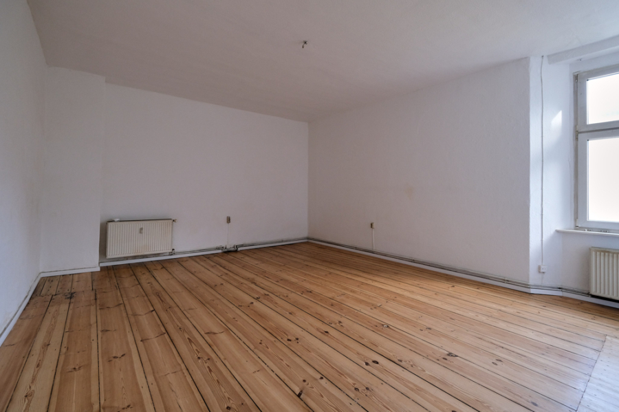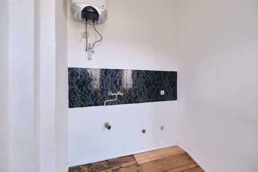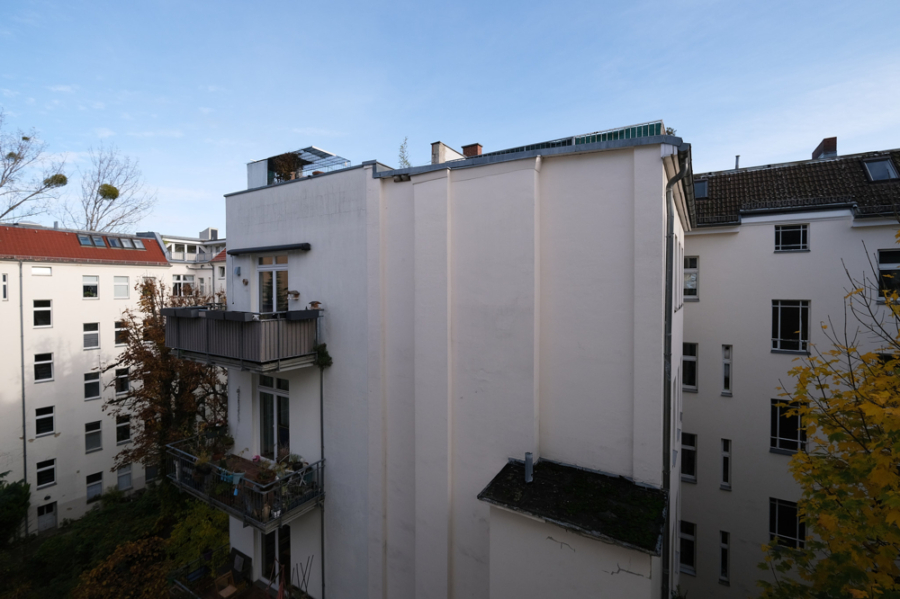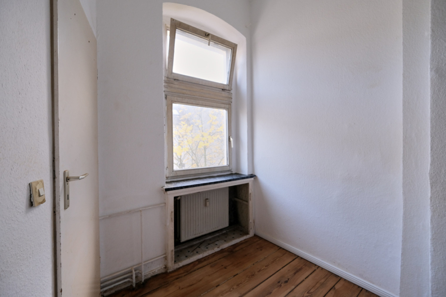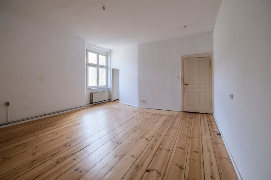 The unrenovated apartment is located on the 4 floor of the side wing of a beautiful Wilhelminian style building from 1900. The house has been renovated and well maintained in recent years, and the attic in the front building has been converted. The practical layout with one large room and approx. 3.40 m ceiling height offers space and design options. The living room and the kitchen have natural light and a view of the green, quiet courtyard.