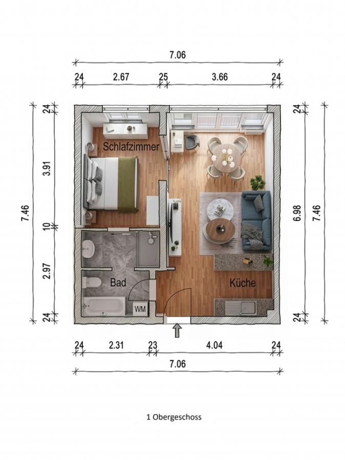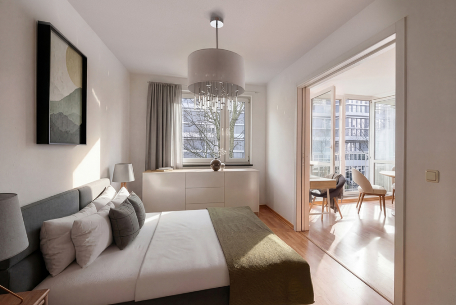Mit dem Eintritt durch die Wohnungstür öffnet sich der großzügige Wohn- Essraum mit einer 7 m Sichtachse von der Küche mit Tresen bis zur großen Fensterfront. Über ein Schiebetürelement kann das Schlafzimmer mit direktem Zugang zum innenliegenden Bad abgetrennt werden. Die Fenster zur Straße haben eine Südostausrichtung mit entsprechend viel Tageslicht und direkter Sonne.