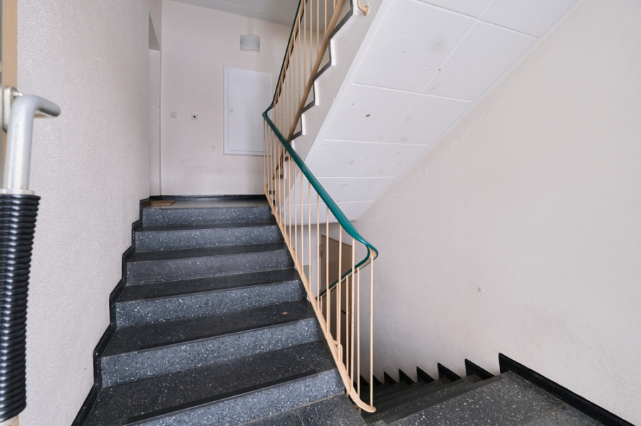 The daylight bathroom has a shower and enough space for a washing machine. The kitchen has an adjoining storage room with plenty of space. Both rooms have windows facing the street with an east orientation. The fitted kitchen can be supplemented with a dishwasher and also has plenty of storage space thanks to the cupboards.