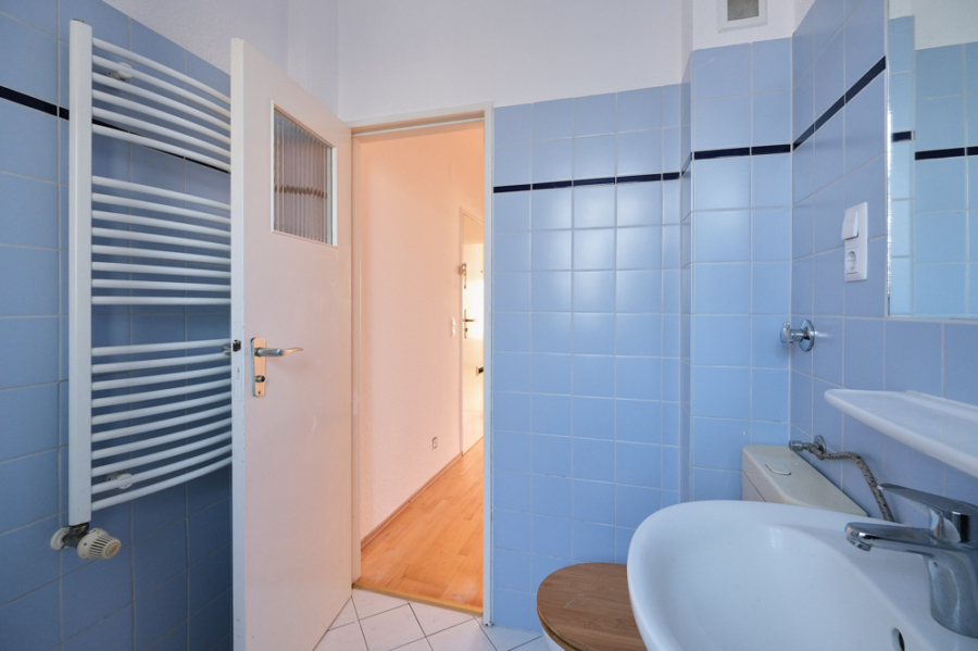 Das Tageslichtbad hat eine Dusche und ausreichend Platz für eine Waschmaschine. In der Küche gibt es einen angrenzenden Abstellraum mit genügend Platz. Beide Räume haben die Fenster zur Straße mit einer Ostausrichtung. Die Einbauküche kann mit einem Geschirrspüler ergänzt werden und hat durch die Schränke ebenfalls viel Staufläche.