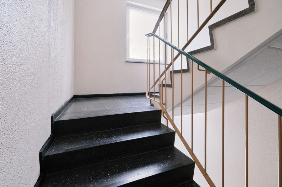 The apartment is located on the third floor of a building complex comprising five houses dating from the 1960s. The floor plan is ideal, with all rooms enjoying natural light and the large living room and bedroom featuring a southwest-facing balcony and an almost unobstructed view over the extensive green spaces to the international student village.