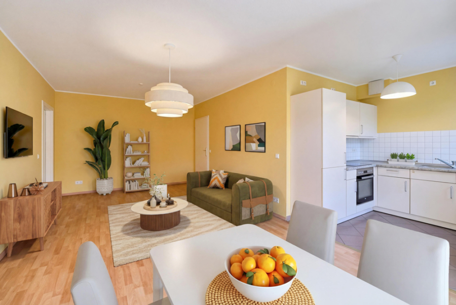Die moderne und helle Wohnung hat einen großen, offenen Wohn-Küchenraum mit Zugang zum Balkon und ein Schlafzimmer. Das Bad mit Dusche und Platz für eine Waschmaschine ist innen liegend und es gibt einen zusätzlichen praktischen kleinen Abstellraum in der Wohnung. Alle Fenster haben eine Ostausrichtung mit direkter Sonne in den Zimmern und auf dem Balkon. Die Küche ist mit einer Kühl-Gefrierkombination und einem Geschirrspüler komplett ausgestattet.