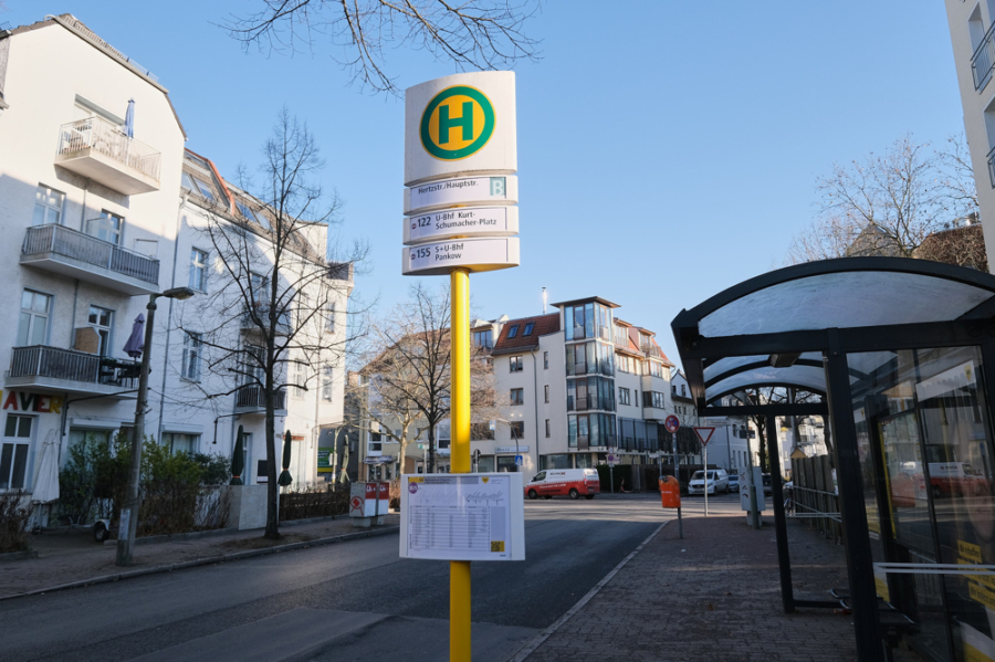 The bus stop in front of the building connects to the Pankow and Kurt-Schumacher Platz S-Bahn and U-Bahn stations, and the S26 S-Bahn station is only a few minutes' walk away, connecting Wittenau via Bornholmer Straße / Anhalter Bahnhof with Teltow.