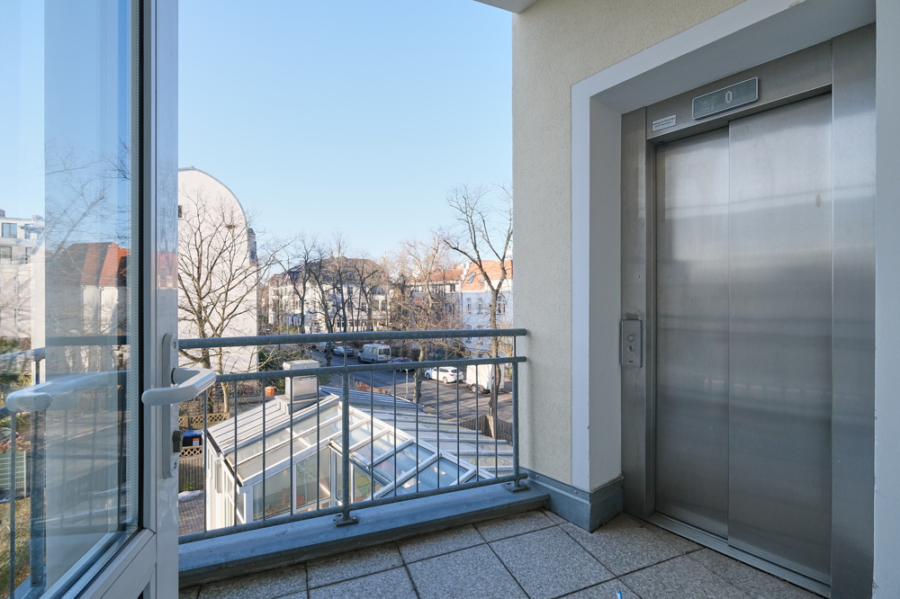 Das Eckhaus aus dem Jahr 2000 hat insgesamt nur 10 Wohnungen und im Erdgeschoss eine KiTa, das Dachgeschoss ist ausgebaut und es gibt einen Fahrstuhl mit Anbindung an jede Etage. Das Haus ist einem sehr gepflegten Zustand, ebenso der Außenbereich mit den 3 Stellplätzen.